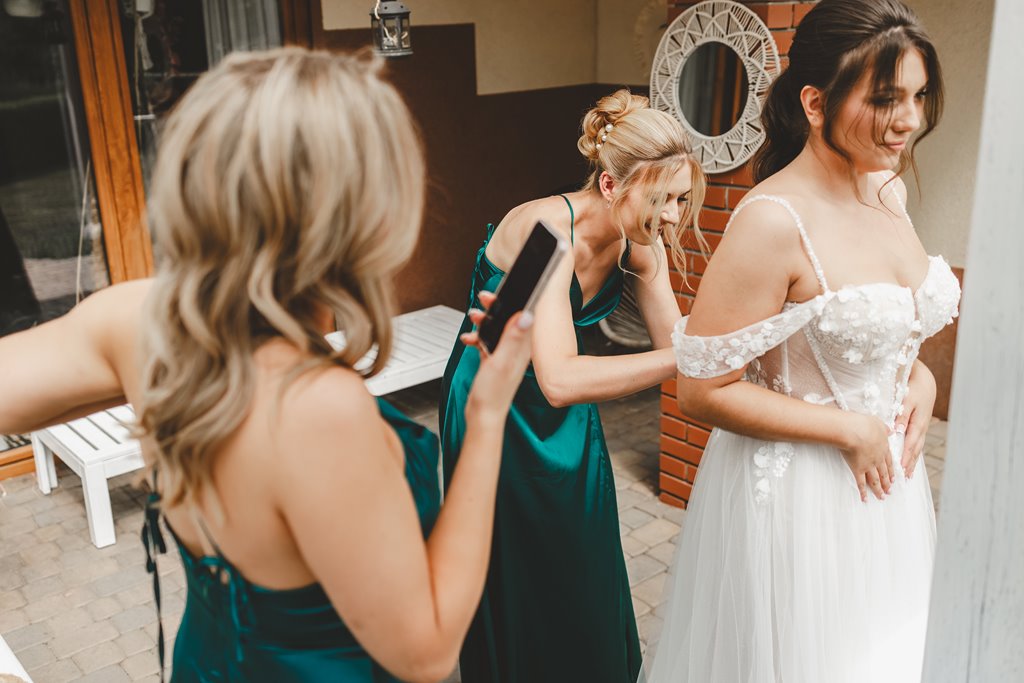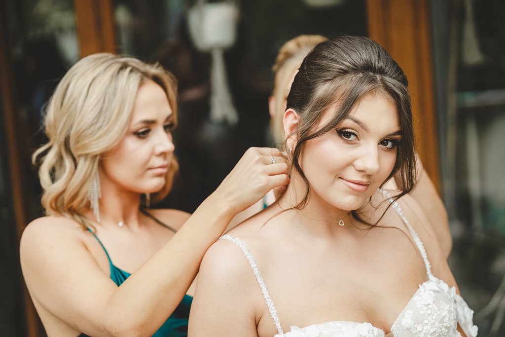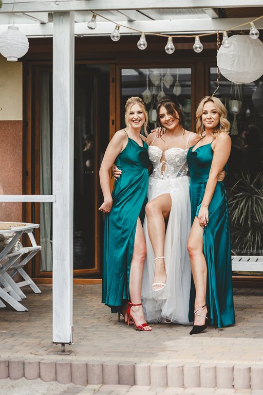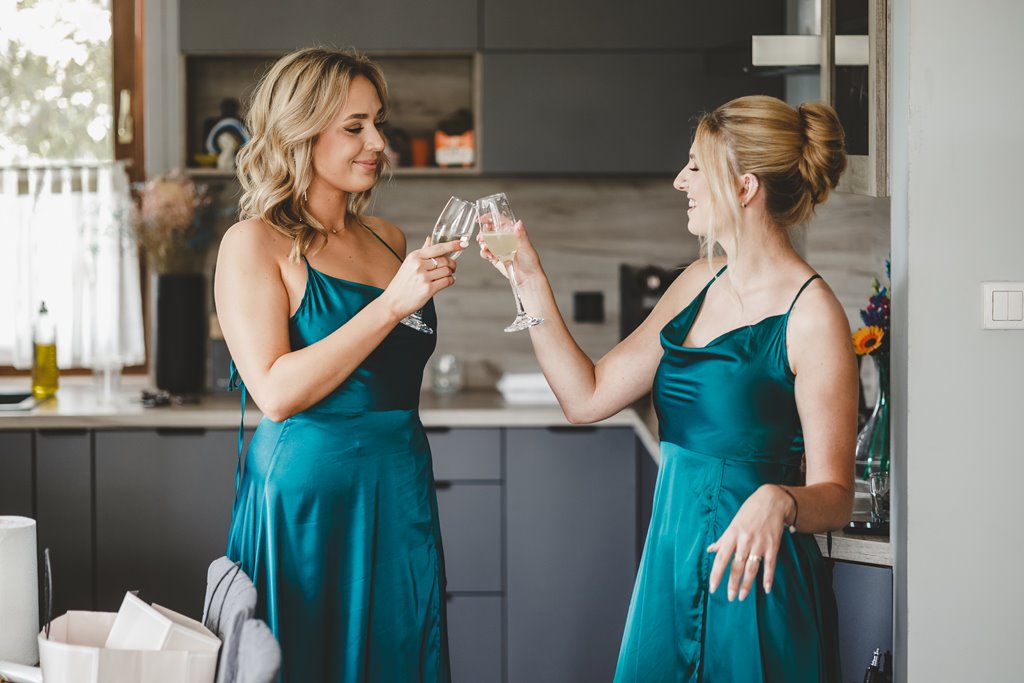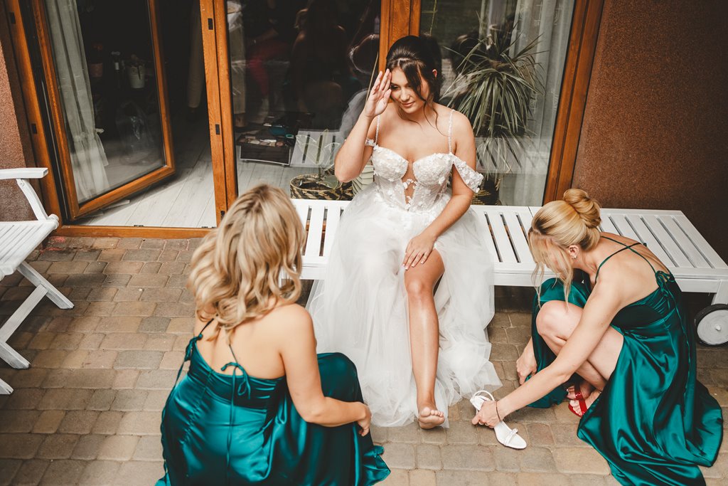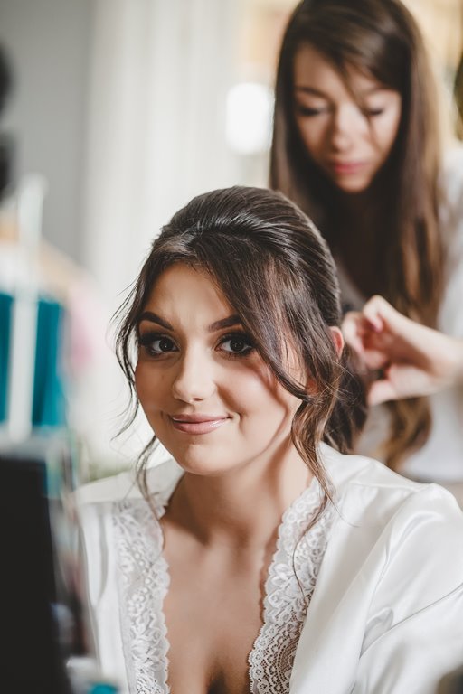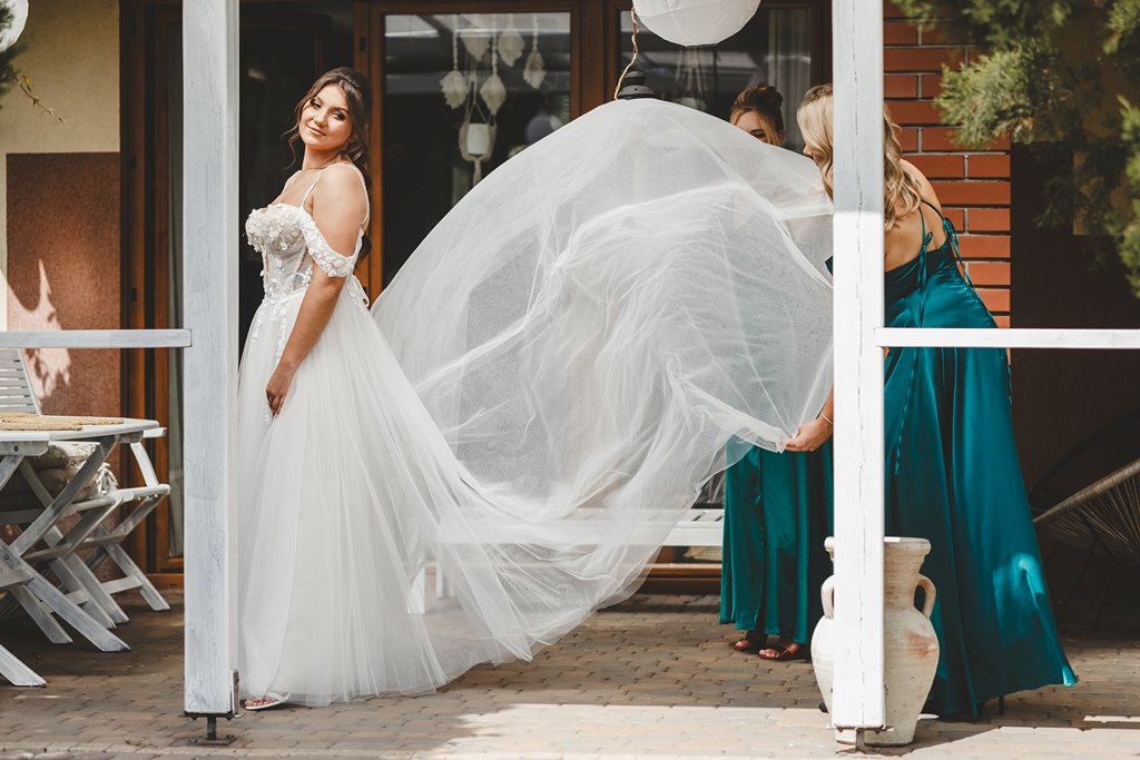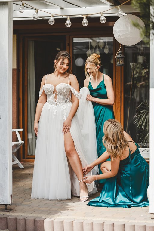 U Aleksandry panowała lekko zabawowa, pozytywna atmosfera. Druhny i makijażystka dopieszczały każdy element – od sukni, przez fryzurę, po dodatki. Stylizacje dziewczyn były spójne, eleganckie i świetnie dopełniały klimat dnia. Część przygotowań przenieśliśmy na zewnątrz, bo pogoda i otoczenie aż prosiły się o kadry na świeżym powietrzu.