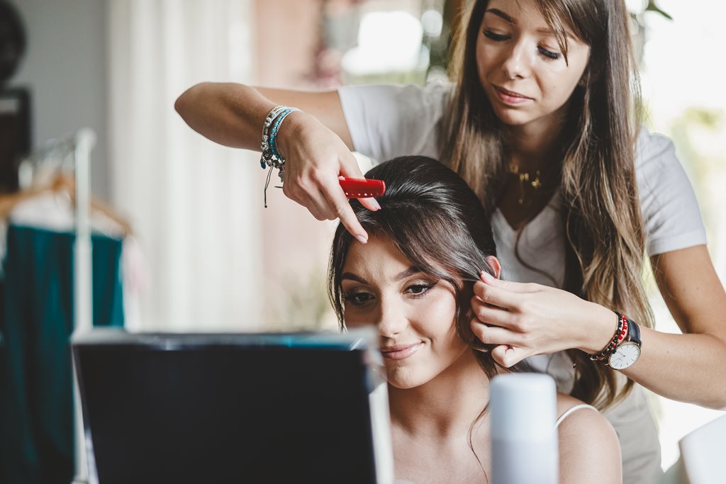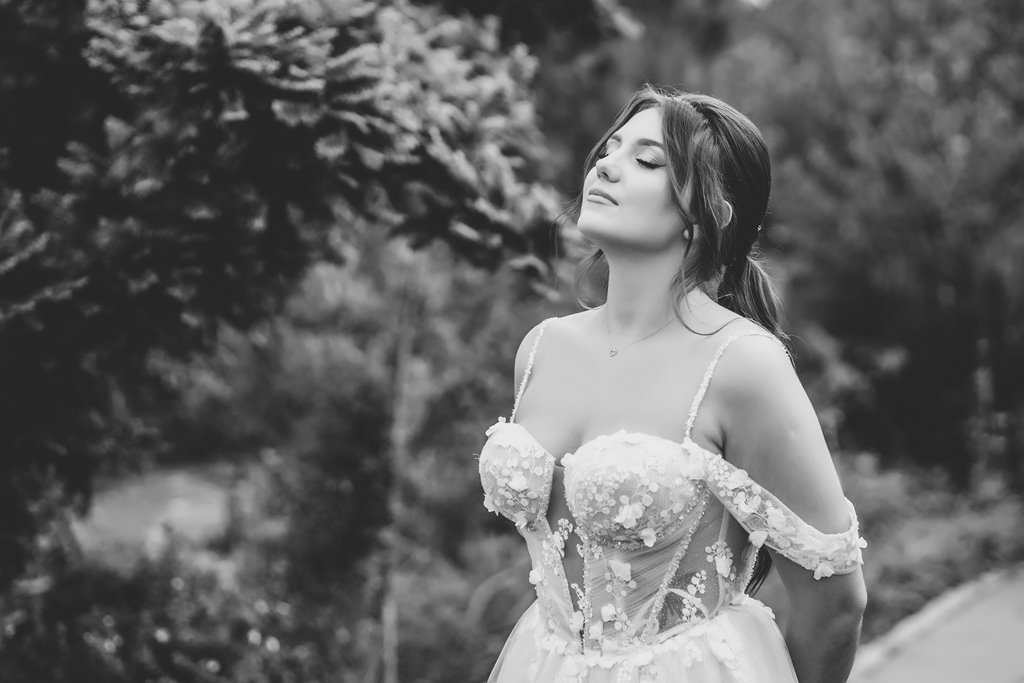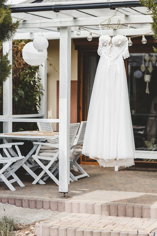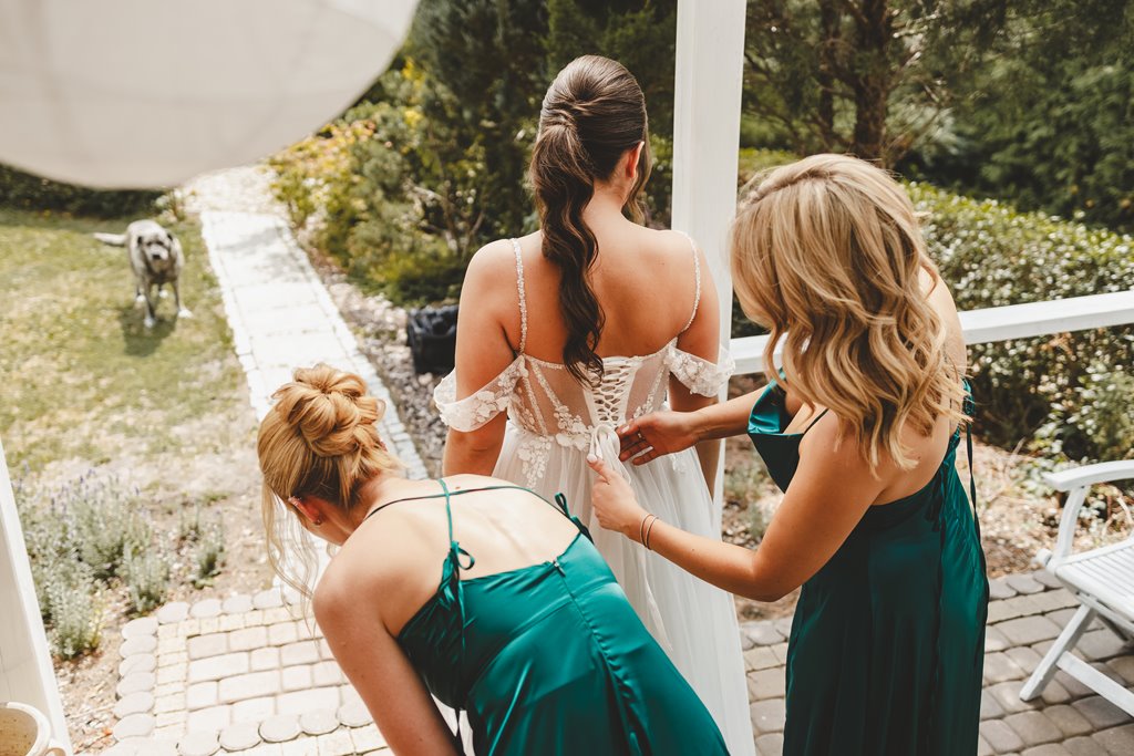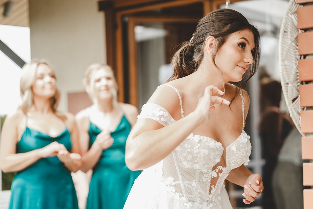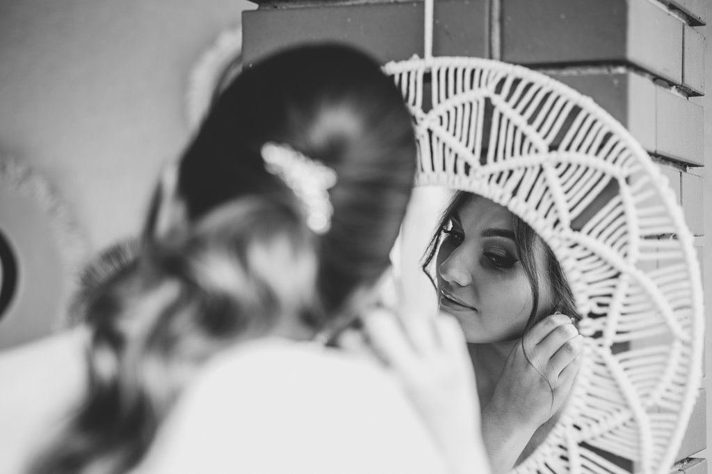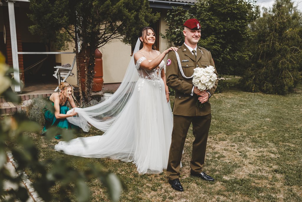 U Aleksandry panowała lekko zabawowa, pozytywna atmosfera. Druhny i makijażystka dopieszczały każdy element – od sukni, przez fryzurę, po dodatki. Stylizacje dziewczyn były spójne, eleganckie i świetnie dopełniały klimat dnia. Część przygotowań przenieśliśmy na zewnątrz, bo pogoda i otoczenie aż prosiły się o kadry na świeżym powietrzu.
