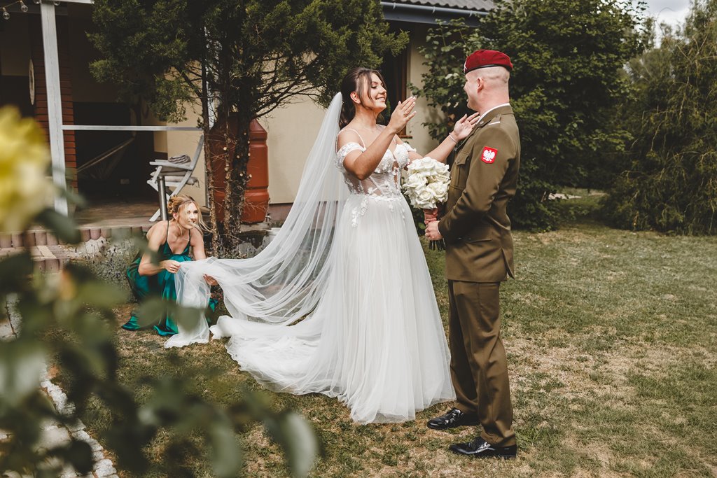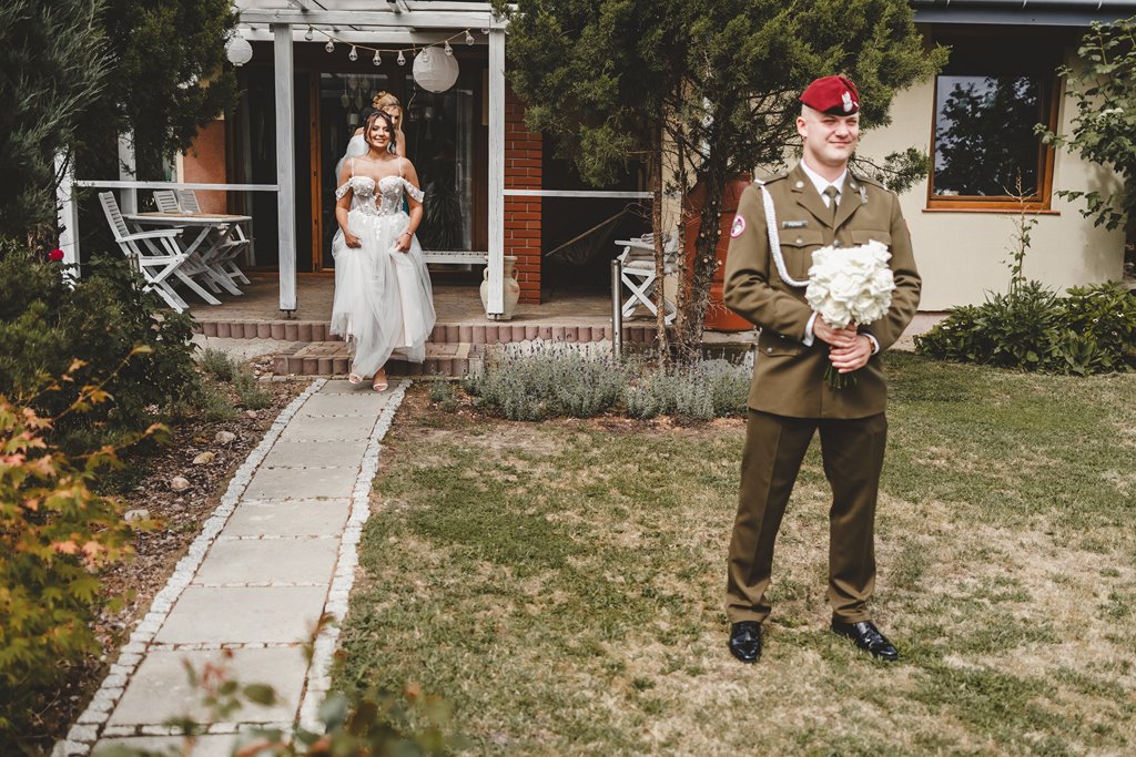 Przyjazd Patryka wywołał jeszcze więcej uśmiechów i dobrej energii. First look w ogrodzie był szybki, naturalny i pełen emocji – idealny w swojej prostocie.